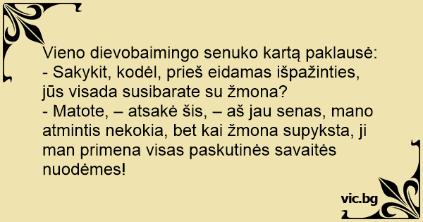 - Matote, – atsakė šis, – aš jau senas, mano atmintis nekokia, bet kai žmona supyksta, ji man primena visas paskutinės savaitės nuodėmes!
