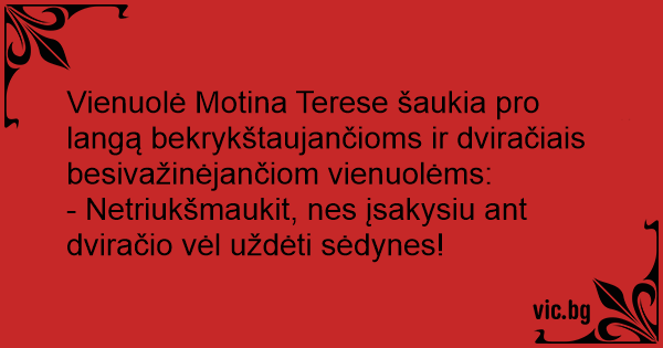 Vienuolė Motina Terese šaukia pro langą bekrykštaujančioms ir dviračiais besivažinėjančiom vienuolėms: