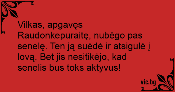 Vilkas, apgavęs Raudonkepuraitę, nubėgo pas senelę. Ten ją suėdė ir atsigulė į lovą. Bet jis nesitikėjo, kad senelis bus toks aktyvus!