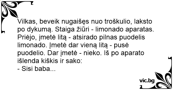 Vilkas, beveik nugaišęs nuo troškulio, laksto po dykumą. Staiga žiūri - limonado aparatas. Priėjo, įmetė litą - atsirado pilnas puodelis limonado. Įmetė dar vieną litą - pusė puodelio. Dar įmetė - nieko. Iš po aparato išlenda kiškis ir sako: