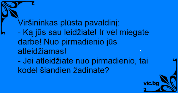 - Ką jūs sau leidžiate! Ir vėl miegate darbe! Nuo pirmadienio jūs atleidžiamas!