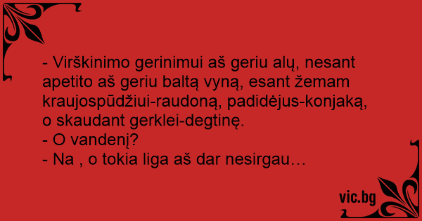 - Virškinimo gerinimui aš geriu alų, nesant apetito aš geriu baltą vyną, esant žemam kraujospūdžiui-raudoną, padidėjus-konjaką, o skaudant gerklei-degtinę.