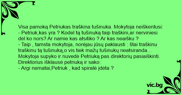 Mokytoja supyko ir nuvedė Petriuką pas direktorių pasiaiškinti. Direktorius išklausė petriuką ir sako: