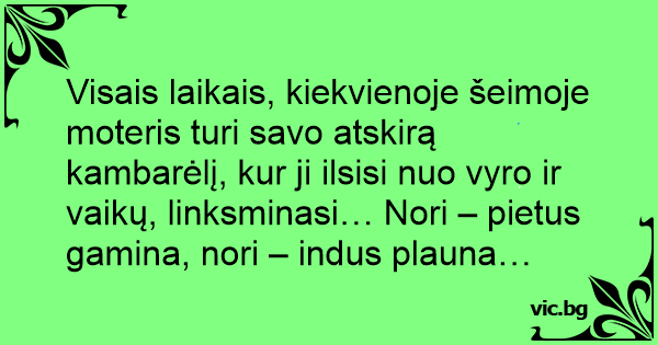 Visais laikais, kiekvienoje šeimoje moteris turi savo atskirą kambarėlį, kur ji ilsisi nuo vyro ir vaikų, linksminasi… Nori – pietus gamina, nori – indus plauna…