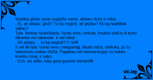- Ei, aš atėjau, girdi? Tu ką negirdi, aš grįžau? Aš ką neaiškiai sakau?