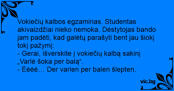 Vokiečių kalbos egzaminas. Studentas akivaizdžiai nieko nemoka. Dėstytojas bando jam padėti, kad galėtų parašyti веnт jau šiokį tokį pažymį: