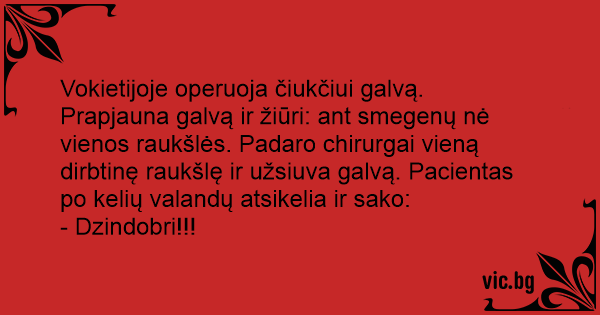 Vokietijoje operuoja čiukčiui galvą. Prapjauna galvą ir žiūri: ant smegenų nė vienos raukšlės. Padaro chirurgai vieną dirbtinę raukšlę ir užsiuva galvą. Pacientas po kelių valandų atsikelia ir sako: