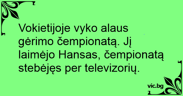 Vokietijoje vyko alaus gėrimo čempionatą. Jį laimėjo Hansas, čempionatą stebėjęs per televizorių.