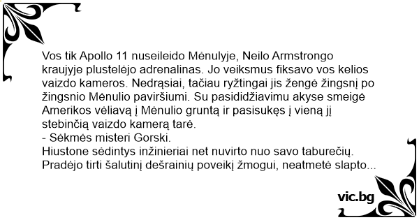 - Misteri Neilai Armstrongai. Ką jūs tada 1969 metų liepos 20 dieną išsilaipinęs Mėnulyje turėjot omeny sakydamas „sėkmės misteri Gorski“?