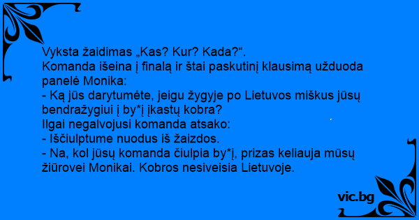 - Na, kol jūsų komanda čiulpia by*į, prizas keliauja mūsų žiūrovei Monikai. Kobros nesiveisia Lietuvoje.