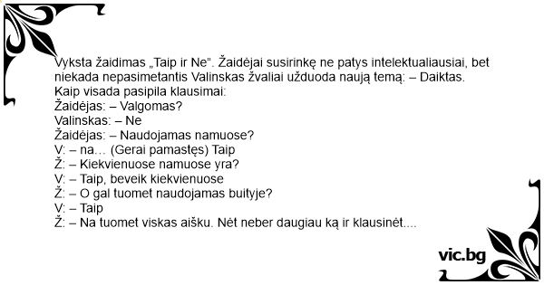 Vyksta žaidimas „Taip ir Ne“. Žaidėjai susirinkę ne patys intelektualiausiai, bet niekada nepasimetantis Valinskas žvaliai užduoda naują temą: – Daiktas.