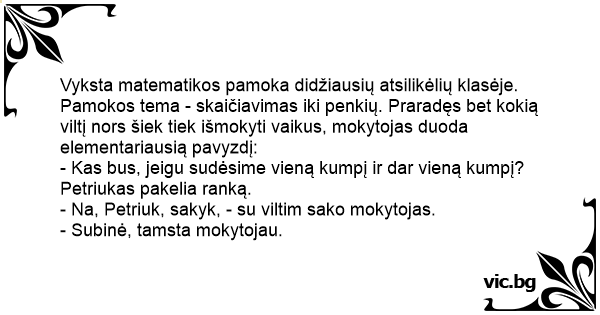 Vyksta matematikos pamoka didžiausių atsilikėlių klasėje. Pamokos tema - skaičiavimas iki penkių. Praradęs bet kokią viltį nors šiek tiek išmokyti vaikus, mokytojas duoda elementariausią pavyzdį: