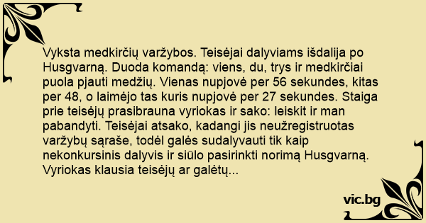Vyksta medkirčių varžybos. Teisėjai dalyviams išdalija po Husgvarną. Duoda komandą: viens, du, trys ir medkirčiai puola pjauti medžių. Vienas nupjovė per 56 sekundes, kitas per 48, o laimėjo tas kuris nupjovė per 27 sekundes. Staiga prie teisėjų prasibrauna vyriokas ir sako: leiskit ir man pabandyti. Teisėjai atsako, kadangi jis neužregistruotas varžybų sąraše, todėl galės sudalyvauti tik kaip nekonkursinis dalyvis ir siūlo pasirinkti norimą Husgvarną. Vyriokas klausia teisėjų ar galėtų dalyvauti su savuoju instrumentu. Šie sutinka. Tada vyriokas išsitraukia iš švarko kišenės pjūkliuką nuo lobziko (toks pjūkliukas fanerai pjauti), pavalo nosine ir eina prie storiausio medžio. Tik zyyyt, 3 sekundės ir medis gatavas. Teisėjai apakę klausia: kur tu taip išmokai medžius pjauti. O šis atsako – Kur, kur Sacharoj. Teisėjai išsižioja ir sako – Juk ten medžių nėra. O vyriukas atsidūsta: O kokie buvo medžiai…
