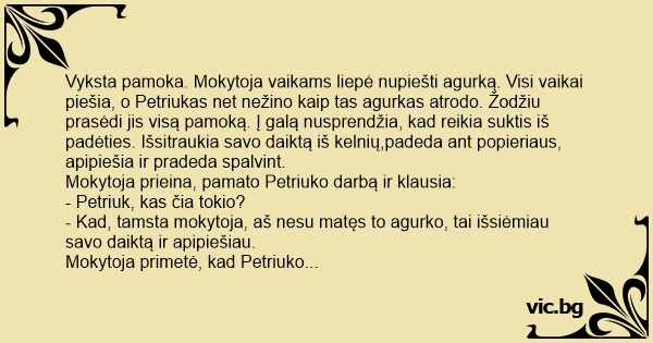 - Kad, tamsta mokytoja, aš nesu matęs to agurko, tai išsiėmiau savo daiktą ir apipiešiau.