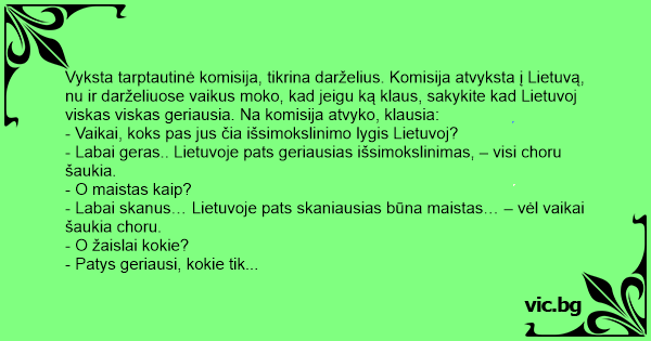 Vyksta tarptautinė komisija, tikrina darželius. Komisija atvyksta į Lietuvą, nu ir darželiuose vaikus moko, kad jeigu ką klaus, sakykite kad Lietuvoj viskas viskas geriausia. Na komisija atvyko, klausia: