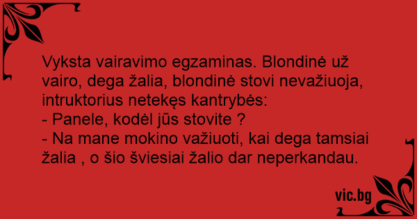 Vyksta vairavimo egzaminas. Blondinė už vairo, dega žalia, blondinė stovi nevažiuoja, intruktorius netekęs kantrybės: