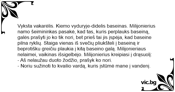 Vyksta vakarėlis. Kiemo vyduryje-didelis baseinas. Milijonierius namo šeimininkas pasakė, kad tas, kuris perplauks baseiną, galės prašyti jo ko tik nori, bet prieš tai jis įspėja, kad baseine pilna ryklių. Staiga vienas iš svečių pliukšteli į baseiną ir beprotišku greičiu plaukia į kitą baseino galą. Milijonieriaus nelaimei, vaikinas išsigelbėjo. Milijonierius kreipiasi į drąsuolį: