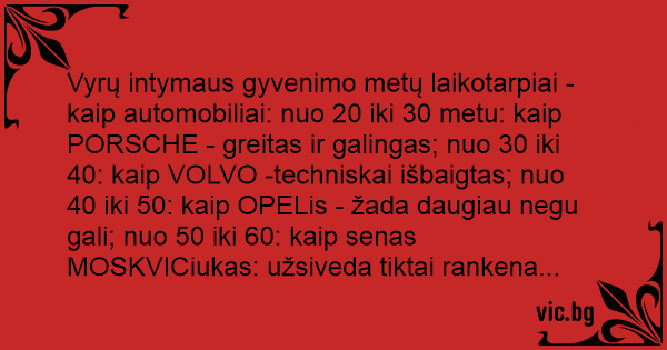 Vyrų intymaus gyvenimo metų laikotarpiai -kaip automobiliai: nuo 20 iki 30 metu: kaip PORSCHE - greitas ir galingas; nuo 30 iki 40: kaip VOLVO -techniskai išbaigtas; nuo 40 iki 50: kaip OPELis - žada daugiau negu gali; nuo 50 iki 60: kaip senas MOSKVICiukas: užsiveda tiktai rankena...