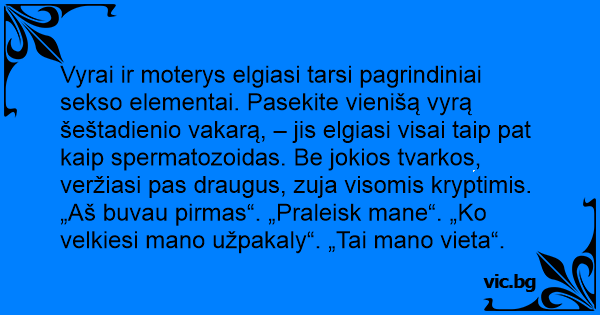 Vyrai ir moterys elgiasi tarsi pagrindiniai sekso elementai. Pasekite vienišą vyrą šeštadienio vakarą, – jis elgiasi visai taip pat kaip spermatozoidas. Be jokios tvarkos, veržiasi pas draugus, zuja visomis kryptimis. „Aš buvau pirmas“. „Praleisk mane“. „Ko velkiesi mano užpakaly“. „Tai mano vieta“.