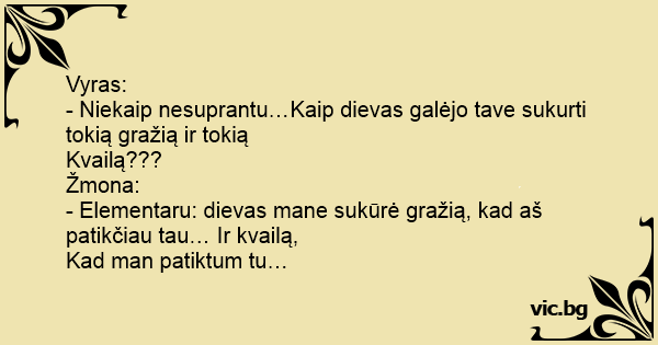 Vyras: - Niekaip nesuprantu…Kaip dievas galėjo tave sukurti tokią gražią ir tokią Kvailą??? Žmona: - Elementaru: dievas mane sukūrė gražią, kad aš patikčiau tau… Ir kvailą, Kad man patiktum tu…