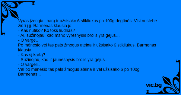 Vyras įžengia į barą ir užsisako 6 stikliukus po 100g degtinės. Visi nustebę žiūri į jį. Barmenas klausia jo:
