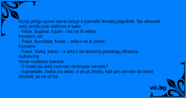 Vyras įstrigo purve kaimo kelyje ir pakvietė fermerį pagelbėti. Tas atsivedė arklį, pririšo prie mašinos ir sako: