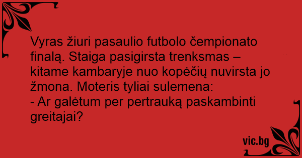 Vyras žiuri pasaulio futbolo čempionato finalą. Staiga pasigirsta trenksmas – kitame kambaryje nuo kopėčių nuvirsta jo žmona. Moteris tyliai sulemena: