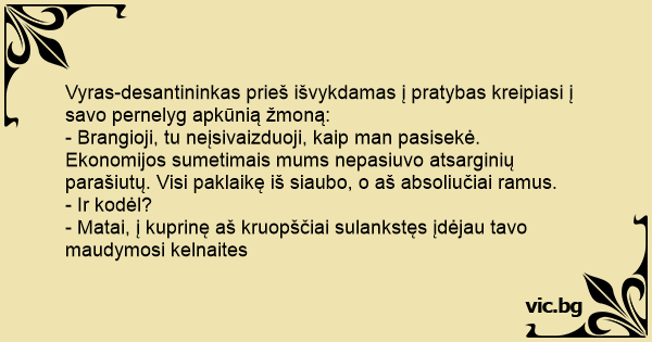 Vyras-desantininkas prieš išvykdamas į pratybas kreipiasi į savo pernelyg apkūnią žmoną:
