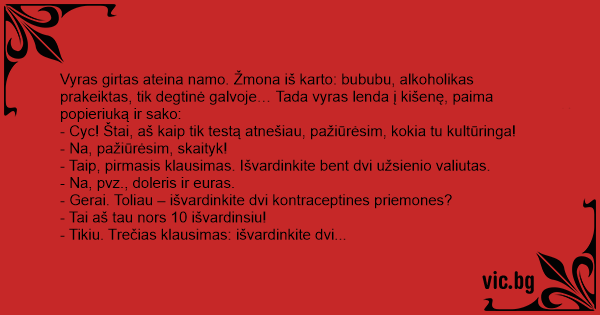 Vyras girtas ateina namo. Žmona iš karto: bububu, alkoholikas prakeiktas, tik degtinė galvoje… Tada vyras lenda į kišenę, paima popieriuką ir sako: