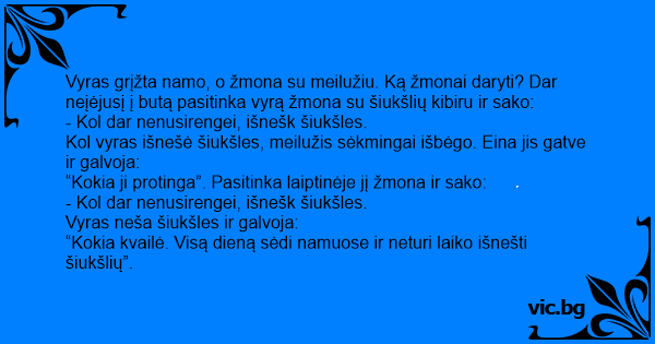 Vyras grįžta namo, o žmona su meilužiu. Ką žmonai daryti? Dar neįėjusį į butą pasitinka vyrą žmona su šiukšlių kibiru ir sako: