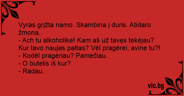 - Ach tu alkoholike! Kam aš už tavęs tekėjau? Kur tavo naujas paltas? Vėl pragėrei, avine tu?!