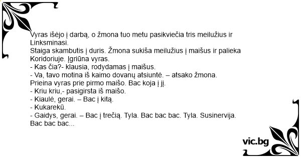 - Va, tavo motina iš kaimo dovanų atsiuntė. – atsako žmona.