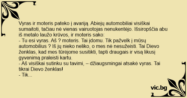 Vyras ir moteris pateko į avariją. Abiejų automobiliai visiškai sumaitoti, tačiau nė vienas vairuotojas nenukentėjo. Išsiropščia abu iš metalo laužo krūvos, ir moteris sako: