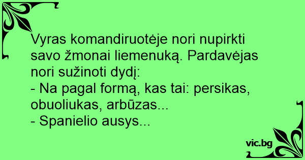 Vyras komandiruotėje nori nupirkti savo žmonai liemenuką. Pardavėjas nori sužinoti dydį: