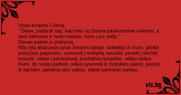 “ Dieve, padaryk taip, kad mes su žmona pasikeistume vietomis, ji sėdi namuose ir nieko nedaro, noriu į jos vietą.“