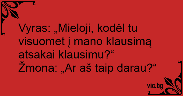 Vyras: „Mieloji, kodėl tu visuomet į mano klausimą atsakai klausimu?“