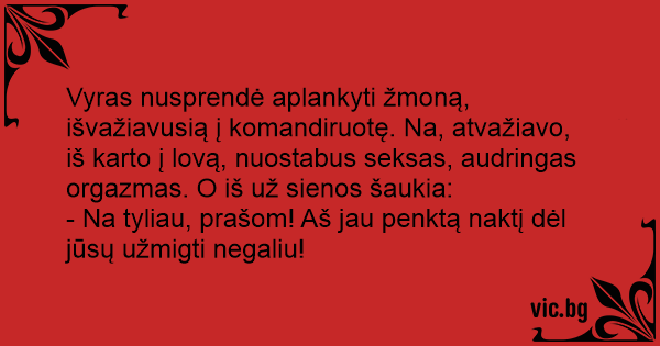 Vyras nusprendė aplankyti žmoną, išvažiavusią į komandiruotę. Na, atvažiavo, iš karto į lovą, nuostabus seksas, audringas orgazmas. O iš už sienos šaukia: