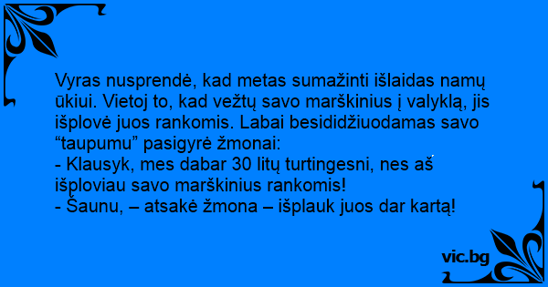 Vyras nusprendė, kad metas sumažinti išlaidas namų ūkiui. Vietoj to, kad vežtų savo marškinius į valyklą, jis išplovė juos rankomis. Labai besididžiuodamas savo “taupumu” pasigyrė žmonai: