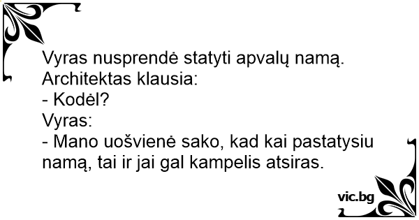 - Mano uošvienė sako, kad kai pastatysiu namą, tai ir jai gal kampelis atsiras.