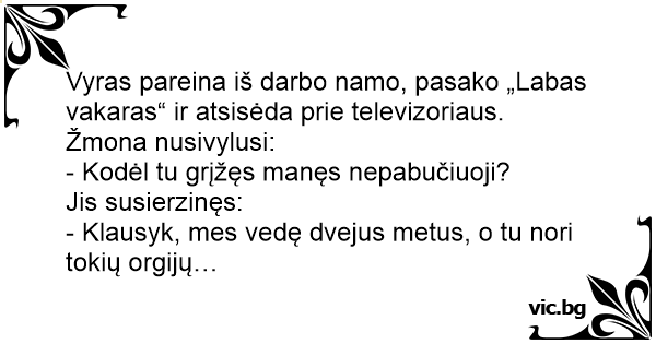 Vyras pareina iš darbo namo, pasako „Labas vakaras“ ir atsisėda prie televizoriaus. Žmona nusivylusi: