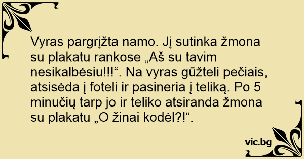 Vyras pargrįžta namo. Jį sutinka žmona su plakatu rankose „Aš su tavim nesikalbėsiu!!!“. Na vyras gūžteli pečiais, atsisėda į foteli ir pasineria į teliką. Po 5 minučių tarp jo ir teliko atsiranda žmona su plakatu „O žinai kodėl?!“.