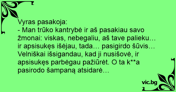 - Man trūko kantrybė ir aš pasakiau savo žmonai: viskas, nebegaliu, aš tave palieku… ir apsisukęs išėjau, tada… pasigirdo šūvis… Velniškai išsigandau, kad ji nusišovė, ir apsisukęs parbėgau pažiūrėt. O ta k**a pasirodo šampaną atsidarė…