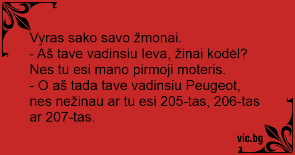 - O aš tada tave vadinsiu Peugeot, nes nežinau ar tu esi 205-tas, 206-tas ar 207-tas.