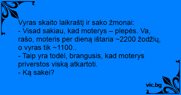 - Visad sakiau, kad moterys – plepės. Va, rašo, moteris per dieną ištaria ~2200 žodžių, o vyras tik ~1100..