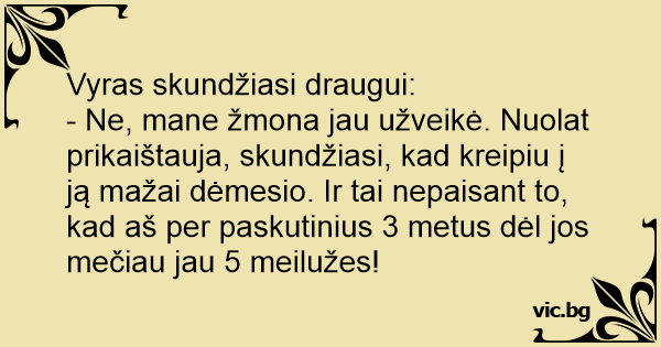- Ne, mane žmona jau užveikė. Nuolat prikaištauja, skundžiasi, kad kreipiu į ją mažai dėmesio. Ir tai nepaisant to, kad aš per paskutinius 3 metus dėl jos mečiau jau 5 meilužes!