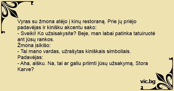 Vyras su žmona atėjo į kinų restoraną. Prie jų priėjo padavėjas ir kinišku akcentu sako: