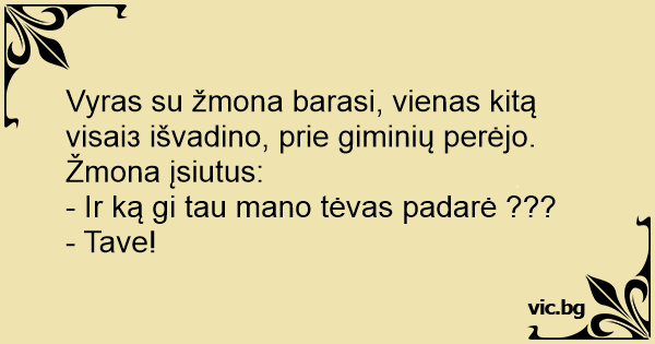 Vyras su žmona barasi, vienas kitą visaiз išvadino, prie giminių perėjo. Žmona įsiutus: