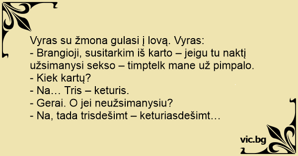 Vyras su žmona gulasi į lovą. Vyras: