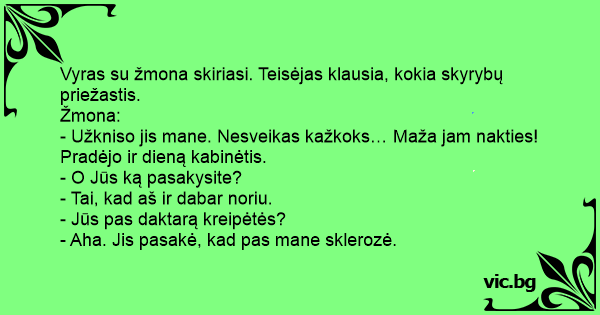 Vyras su žmona skiriasi. Teisėjas klausia, kokia skyrybų priežastis.