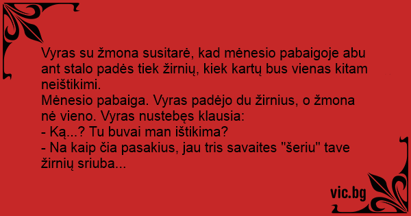 Mėnesio pabaiga. Vyras padėjo du žirnius, o žmona nė vieno. Vyras nustebęs klausia: